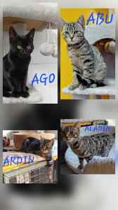 - Tout d'abord une fratrie de 5. Élevés en famille d'accueil avec leur mère, qui est restée dans cette famille, ils sont tous très câlins. La petite minette, Asmine, a déjà trouvé son foyer. Les 4 frères s'appellent Aladdin, Ardin, Abu et Ago. Ils sont épanouis, vifs et joueurs, chacun avec sa personnalité bien sur (voir les fiches individuelles)